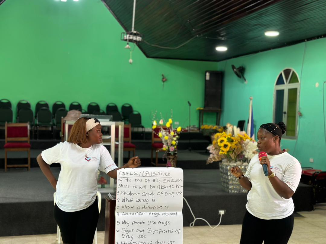 Education session on substance use and addiction prevention for students in Monrovia.